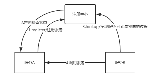 A服务调用consul的API注册自己 -> consul定时检查A服务状态(默认)或A服务本身与consul维持心跳请求 -> B服务通过consul提供的DNS调用A服务(默认)或从consul获取健康的服务列表并通过某种算法选择合适的服务调用。