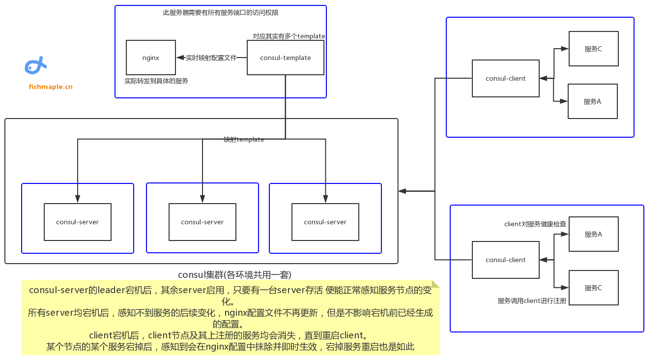 基于consul的特性,应当使用每个独立服务器部署client,client负责健康检查并注册自己到server的,切忌直接将服务注册至server节点上,这样会失去可用性的特性;