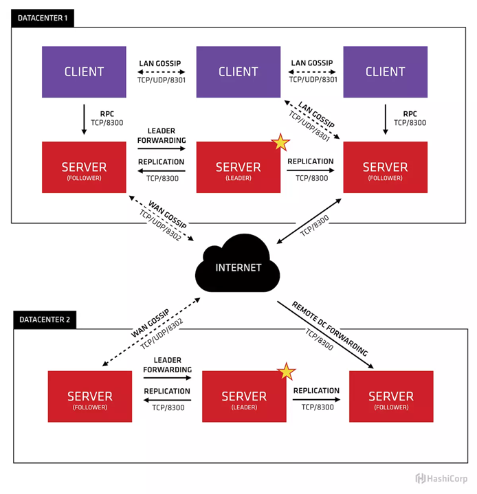 基于Consul的leader选举模式,Consul官方建议的是consul-server采用3或5节点来保证可用性,而每台client注册在本地的服务器上负责健康检查和向server上报信息,不同概念的应用处于不同的数据中心下。下图源自Consul官方站点: